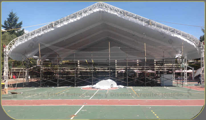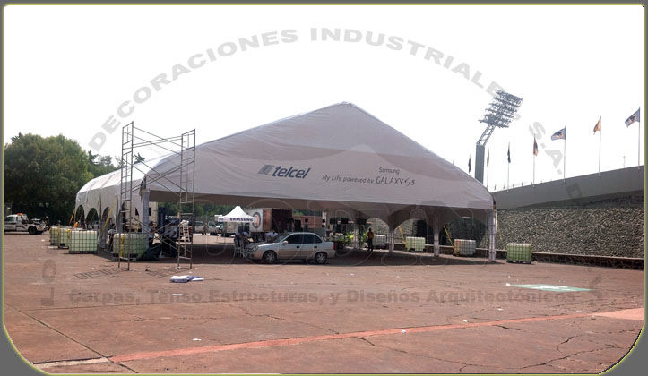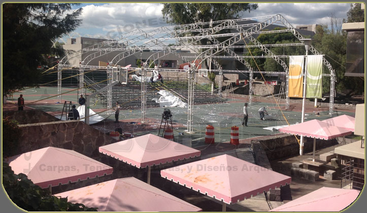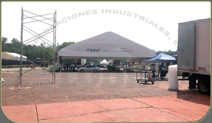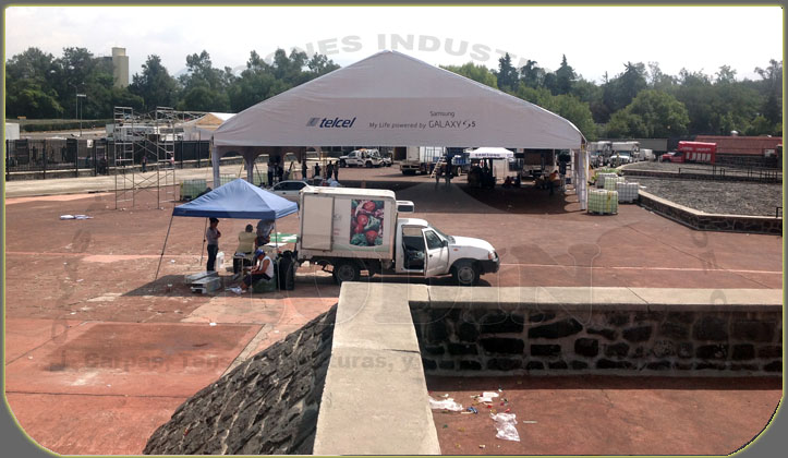 Le ofrece innovación de carpas con estructura desmontable, cubierta de lona fabricada en lona black out que no permite el paso de la luz solar, plafón de tela que cubre la estructura, cortinas, con ventana de hule cristal con o sin ventanas manejamos diferentes anchos 15.00, 20.00, 25.00 y 30.00 metros de ancho sin postes intermedios para almacén, Ferias, Exposiciones, Bodas, Inauguraciones.