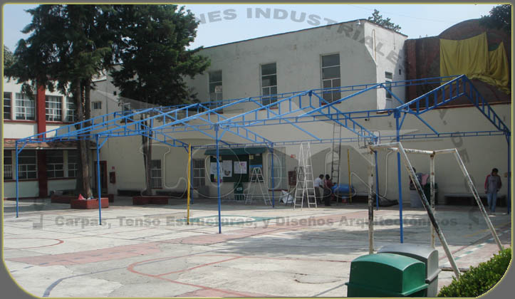 estructura fabricada en acero, cubierta de lona, tapas frontales y traseras, cortinas perimetrales con ventanas de hule cristal o lisas, plafón en tela, cubre postes, luz.